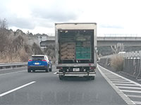初日の出暴走の帰路ですが、何の因果か、積み荷丸出しトラックのすぐ後ろになってしまいました。
