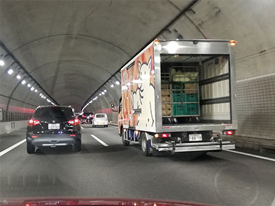 シャッターがちょいちょい下りてくる様はおもしろいのですが、いつまでもここにいては危険。あおって左に車線変更させて追い抜いた、というのは嘘で、距離が離れるまで当方が左に移っておとなしくしてましたよ。